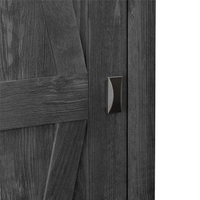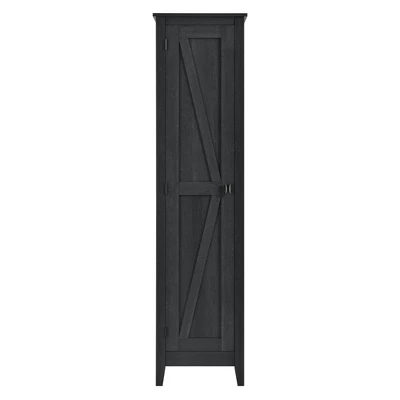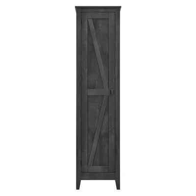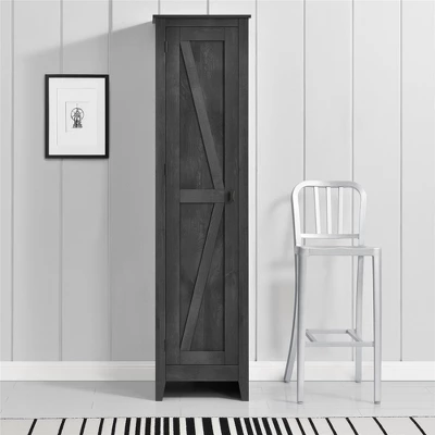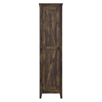 The Room & Joy Brookside 18” Wide Storage Cabinet is a stylish way to stay on top of your organization. The rustic barn style design and sleek tapered feet gives the look of an old weathered cabinet but the sturdy laminated particleboard and MDF make this cabinet the perfect piece to house your home office supplies, extra linens, seasonal clothing, nonperishable food and more! Open up the door to 4 spacious shelves, 2 adjustable, to fit items of differing sizes. The door can be assembled on either the left or right side so you can arrange your room however you need. The Brookside Cabinet is recommended to be assembled and moved by 2 adults. A wall anchor kit is provided for extra safety and security. After assembled, this cabinet measures to be 71.89”H x 18.19”W x 15.67”D.