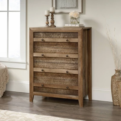 Style and storage all in one! Find a place for all your clothes while adding a one-of-a-kind look to your bedroom with this 4-drawer chest from the Dakota Pass collection. This beautiful dresser features four large drawers that open and close on smooth metal runners. These spacious drawers provide you with easy access storage of items like stacks of slacks and your favorite blouses to comfy sweatpants and your collection of t-shirts. It has a place for all your things! Each drawer front is detailed with a graphic script pattern that adds a beautiful visual that is sure to stand out in your home. Its spacious top surface also provides you with room to store additional bedroom items or display home décor like an accent lamp, bottles of cologne, your makeup bag and pictures of your family and friends too. Finished in Craftsman Oak and detailed with attractive hardware, this stunning chest of drawers is just what your bedroom is missing.