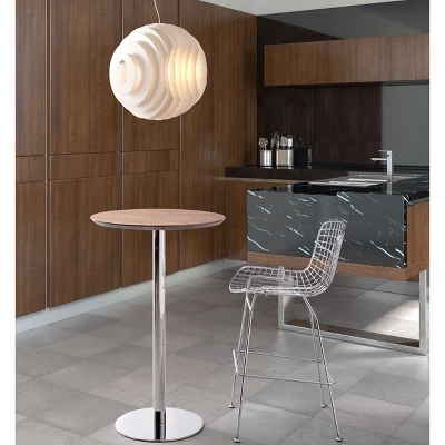The Bergen Bar Table is a symphony of simplicity. Boasts a walnut finish and gleaming chrome base. Elegant planning adds craftsmanship.