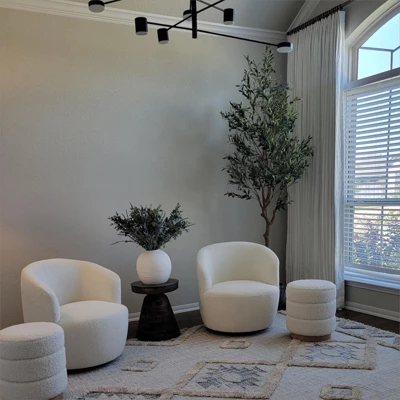 These Swivel Barrel Chairs Set Of 2 are a great addition to any space, offering both comfort and style. With their unique design, they combine the classic look of a traditional armchair with the convenience of a swivel base. The chairs are upholstered in high-quality boucle fabric, which provides a smooth and comfortable feel. The padding consists of high-density foam, ensuring excellent support, and the chairs are built with a sturdy wood frame.The boucle fabric adds visual interest and texture to the chairs, while also being durable and easy to clean, making them ideal for everyday use. The 360° swivel base allows for easy movement and versatility, making these chairs suitable for various rooms such as the living room, bedroom, office, or nursery.