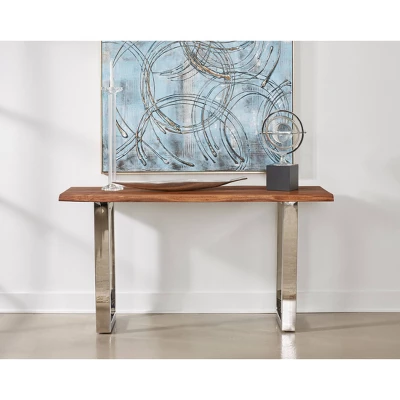 As a focal point in your entry or to put behind your sofa with lamps and photos, this Console Table will make a definite statement! The multi-hued grains of rich Sheesham wood have been enriched by our Brownstone Nut Brown finish, and flow over the top and live edges, giving it a distinctive look all it’s own. Polished stainless steel U shaped legs gleam with a mirror-like sheen for an overall reflective appearance that will fit perfectly with your eclectic decor. Use in conjunction with the matching End and Cocktail Tables for a stunning presentation.