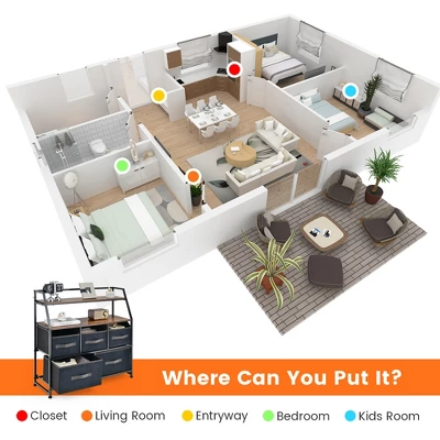 The 5 deep and large drawers that are removable and foldable permit you to stow your clothing here. With the 2-tier open top shelves, you can have access to those often-used items. We all know that safety comes first. Hence, 2 anti-toppling devices are included for the security of the whole family. Furthermore, the sturdy metal frame along with the adjustable anti-slip foot pads not only enhance stability but also protect the floor. The industrial outlook fits various home styles well. And whether in the living room or bedroom, this dresser storage organizer behaves well.