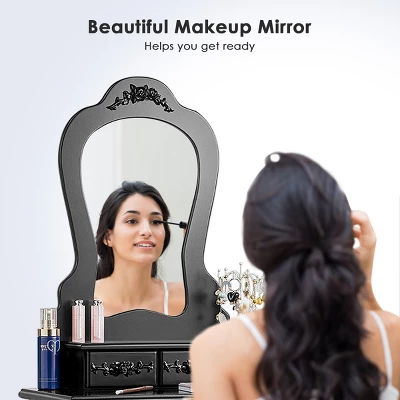 Every girl wishes to have a glamorous dressing table with all her jewelry and make up. Don’t hesitate, let us come your princess dream true. This vanity table set comes with mirror, stool and 3 storage drawers. Powerful storage capacity is great for storing all your jewelry. A smooth Removable tabletop provides space for cosmetics and beauty supplies. Elegant look compares well with your furniture, perfect to use in your bedroom. Do not miss our this dressing table