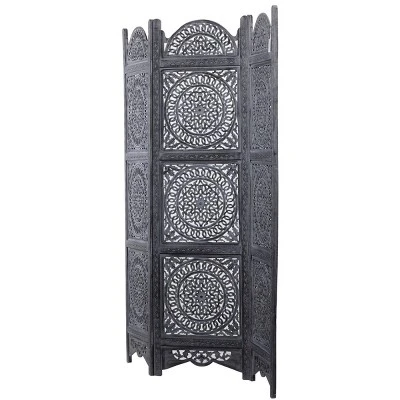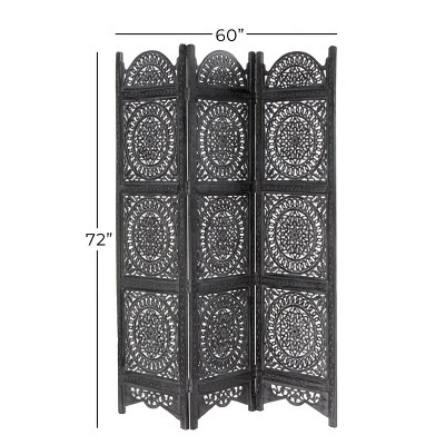 Use this wooden room divider to break up negative spacing in your home or to create privacy. This item ships in 1 carton. Due to the handmade nature of this item, no two will be alike, there will be slight differences in shape, size, and color. Suitable for indoor use only. This item ships fully assembled in one piece. Made in India. Item features 3 panel screens. This is a single black colored folding panel partition. Eclectic style.