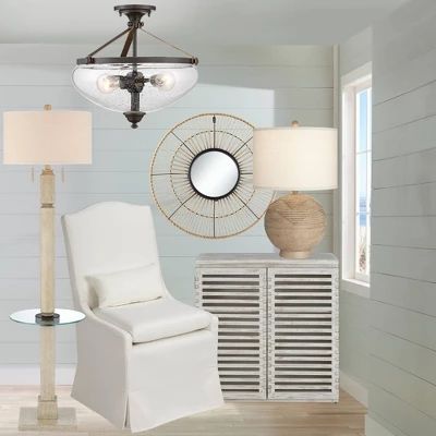 - Farmhouse, coastal style accent cabinet with slat doors.