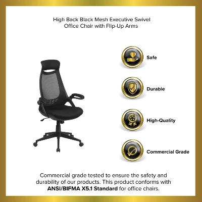 This futuristic designed chair will take you from ordinary to extraordinary! The flexible mesh material forms to your back to provide a relaxing sitting experience. Mesh office chairs can keep you more productive throughout your work day with its comfort and ventilated design. The breathable mesh material allows air to circulate to keep you cool while sitting. High back office chairs have backs extending to the upper back for greater support. The high back design relieves tension in the lower back. The waterfall front seat edge removes pressure from the lower legs and improves circulation. The pneumatic adjustment lever will allow you to easily adjust the seat to your desired height. The flip-up arms are great for users who like the option of an armless chair without the hassle of detaching them. For your next office chair, look no further than this comfortable and stylish mesh office chair! Additional Features: Waterfall Seat reduces pressure on your legs, Pneumatic Swivel Seat Height Adjustment, Padded Flip-Up Arms, Heavy Duty Nylon Base, Dual Wheel Casters