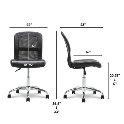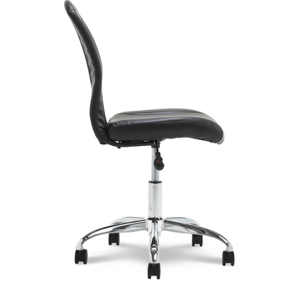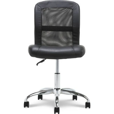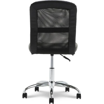 Bring comfort and convenience to your home office with this Essentials Computer Chair from Serta. Featuring faux-leather upholstery and a perforated back, this swivel computer chair offers plenty of functionality without shirking on style, helping you elevate your home decor. The padded seat helps you stay comfortable while you’re working, while the gleaming metal frame offers sleek style and reliability. Attached wheels make for easy movement, whether you’re hard at work or moving from room to room, and the adjustable feature lets you raise and lower this armless computer chair to find the perfect height.