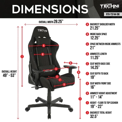 The Techni Sport TS-F44 Fabric Ergonomic Office High Back Computer Racing Gaming Chair will put the pedal to the metal on productivity in any office or game room. Unlike regular office chairs, it gives an eye catching racer style appearance and modern look to spruce up any environment. The cool resemblance of a sport’s car interior, will let your imagination “race” as you recline and swivel in superb comfort for gaming or work sessions lasting 8 hours or more. This ultimate computer gaming chair is made with synthetic TechniFlex fabric and features a height adjustable memory foam seat, reclining back mechanism up to 150 degrees, tilt & tension mechanism control, ergonomic and adjustable headrest and lumbar support cushions, height adjustable and swivel armrests, and a durable nylon base with non-marking 2″ casters. Seat adjusts from 17″ to 20.5″ high. 3% of sales go toward causes that fight against Alzheimer’s Disease. Weight Capacity: 250Lbs. Color: Black