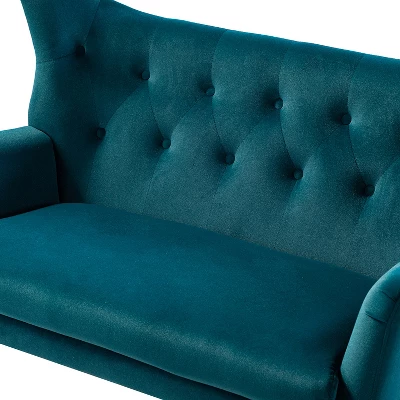 Providing a fresh and pleasing look to your space and adding little characteristics. This high-quality foam-filled accent loveseat with a sturdy solid and manufactured wooden frame provides superb comfort and support. Shown in a beautiful velvet upholstered fabric, its sleek lines, comfortable for skin touch, and features an on-trend solid hue thatÂ’s bound to blend in with your color scheme. With button-tufted details decorating the chic wingback for a dash of distinction and four slender legs rounding out a fatal attraction, this small loveseat for you and your loved one brings soft and warm enjoyment at home. Whether you are looking for an intimate conversation with someone or a place to stretch out in style, you will be well covered. It will have no problems blending into your home decoration with natural, modern style and incredible durability, the perfect pick for bedroom, living room, and other scenes.Item Size:50.7″Wx29.3″Dx37″H.