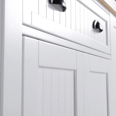 - Added Beauty & Security: Our sideboard features a beadboard door panel with antique style drawer and door for extra beauty. This small kitchen island also comes with wall attachments for added stability and security, should you decide to turn your island into a peninsula.