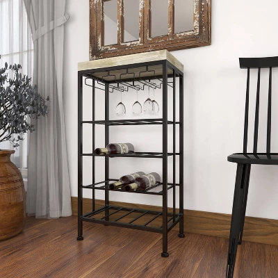 - A 4-tier wine storage with glass rack highlighting black metal shelves with wooden table top