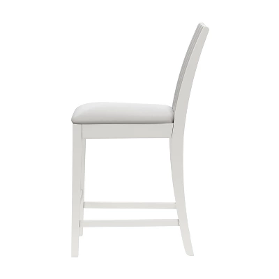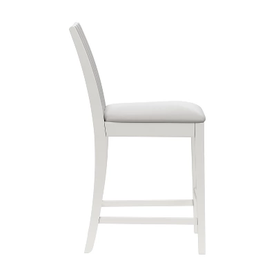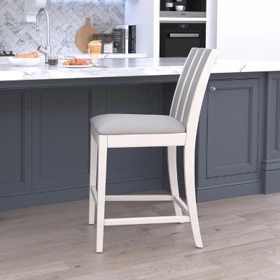 Pour yourself a hot cup of coffee, grab a pencil and crossword puzzle and settle in to watch the morning roll in from the comfort of this wooden counter stool. The easy breeze vibe of this bar stool is created by the neutral white finish and classic frame design. The plush padded seat in a textured fog gray upholstery wraps around the double-sided channel tufted back. The cording detail of this wood stool makes it the perfect spot to kick back and relax. With a calming coastal cottage style, this stool effortlessly adapts to many décor and design styles. Assembly required.