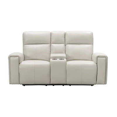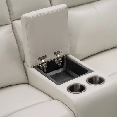 Sleek modern design paired with the magic touch of technology, introducing the Karina Leather Power Reclining Collection. This collection offers ultimate comfort with its high-density foam cushions wrapped in a beautiful ivory top-grain leather and a reclining feature at the press of a button. On each reclining side is a USB port to charge your mobile devices while you recline and relax.