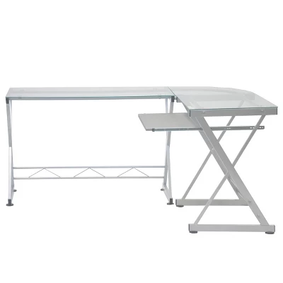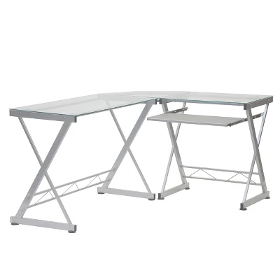 This Techni Mobili L-shaped Reversible Glass Corner Desk embodies the essence of modern design with a minimalist yet functional design that can be configured to your preference, with the long and short sides reversible on the left or right hand. It is made with a heavy-duty 8 mm tempered safety glass desktop, scratch-resistant powder-coated steel frame. Its slide-out keyboard shelf equipped and is made of MDF wood laminate. The square glass desktop panels can each hold up to 66 lbs, the corner glass desktop panel have a 44 lbs weight capacity, and the keyboard shelf can hold up to 22 lbs. Color: Clear