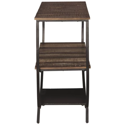 No ordinary take on modern farmhouse styling, this console sofa table serves up shapely style. Brown, gray and white hues give the distressed top and shelf loads of cool character. Curvaceous black metal base brings a fresh twist into the mix. Signature Design by Ashley is a registered trademark of Ashley Furniture Industries, Inc.