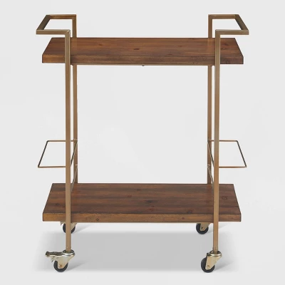 Keep your home bar mobile and smartly placed with this modern bar cart. This multi-purpose rolling trolley is great for everyday kitchen use or while entertaining. Smooth rolling wheels and two bronzed metal handles make it easy to move the party from the dining room to the living room, and casters lock in place for extra stability. Two bottle racks offer extra storage for wine bottles or condiments. Enjoy the clean lines of the industrial metal frame, constructed with sturdy iron to support two shelf tiers in a rich walnut color. Perfectly sized mobile utility cart to stock up with your favorite barware and serving accessories.