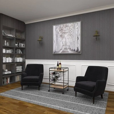 • This bar cart with wheels highlights a natural wood brown finish with black obsidian frame finish