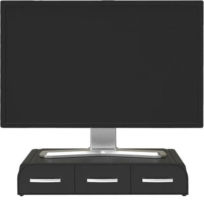 Instantly improve your work experience with DURABLE & LIGHTWEIGHT monitor stands with storage drawers. Use with most flat screen display monitors or televisions, laptops, printers and more – they are stylish and neutral in design so they will coordinate with any at work or home office décor. A great wey to reduce STRESS, NECK AND BACK PAIN – Raise computer monitors, laptops and tv displays to a comfortable viewing position for more optimal work conditions while improving neck position – helps to reduce back pain caused by poor posture while working or watching tv. ANTI SLIP CONSTRUCTION keeps units still while you work. EXTRA STORAGE IS A PLUS – additional organizational space is always a benefit, even if it’s just to hold your pencils, pens and post-its. Looking for a place for your keyboard or papers, slide them underneath the riser drawer to create additional organization for yourself. PERFECT FOR HOME AND OFFICE USE: Enjoy improved performance and work efficiencies with these monitor or tv stands while you work or watch tv – LED, LCD, OLED Flat Screen Displays, iMac, desktop PC and more PLUS Storage. SPACE SAVING UNIT WITH DRAWER: Computer and monitor risers create additional storage on your desk, table or home entertainment furniture by raising your device off of the surface – store magazines, pencils, paper and more in the built-in drawer. ORGANIZATIONAL AND STORAGE: Improve overall organization on your desk or home office – add more desk surface by lifting your monitor up onto a desktop or tabletop stand – store pens, pencils and office supplies inside. REDUCE EYE STRAIN: Creating an optimal work or entertainment viewing experience is critical for eye, neck and back strain – sitting at the recommended distance from your device will help to reduce pain due to poor posture. STUDENT MUST HAVE: The perfect addition to any dorm room – create a comfortable and safe study environment for hours of studying on computer or tablet device or for TV viewing with friends. Monitor or computer risers are always EASY TO CARE FOR AND CLEAN. Clean your monitor stand riser with damp cloth for long lasting use and storage as needed. These monitor or tv screen stands make great gifts for the holidays, people who work at home or students going off to college. Perfect for all ages and both guys and gals, computer stands or risers can be used in any room in your home. Lift things off the counter in the kitchen to create more space and organize your recipes inside and place tv or iPad for easy viewing while cooking on top. Perfect for the bedroom to raise your tv to the right viewing height. They make a great back to college gift for students or first time students going off to school.