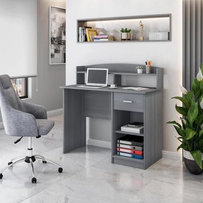 Create a beautiful workspace that will keep you motivated and focused throughout the day with our Techni Mobili Modern Desk with Hutch. Its spacious tabletop surface provides you with ample amount of room for all your must-have desk essentials – from your laptop, to notepads, stapler, cup holder and of course even your coffee mug. This desk features clean lines and with a solid gray finish surface. It also includes an organizer hutch that features 2 large top shelves , two bottom convenient storage spaces as well as a storage drawer for easy access to your miscellaneous office supplies.