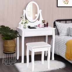 Costway Wooden Vanity Makeup Dressing Table Stool Set Bathroom White