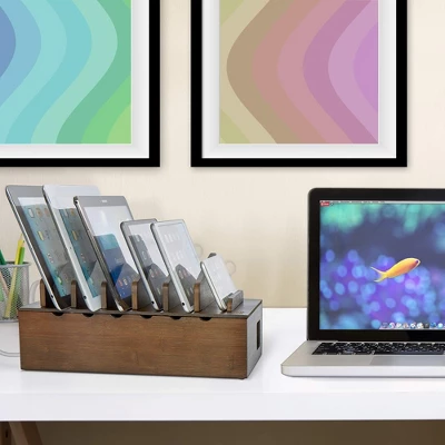 Prosumer’s Choice offers a multi-device charging station perfect for up to five smartphones or tablets. The all-in-one organizer rack keeps power strips or surge protectors (up to 11 inches) out of sight. It includes 5 removable racks, cable management slots, and anti-slip rubber feet. The low-profile design fits any desk, kitchen counter or nightstand with a jet-black finish. 100% natural bamboo from an FSC Certified forest and BSCI certified socially responsible facility.
