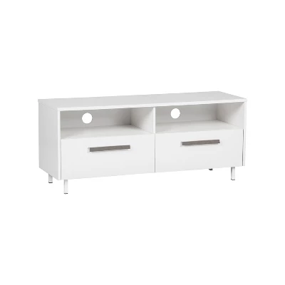Go for sleek and streamlined with this alaska 47-inch TV media console. Designed in bright white woodgrain finish with a clean profile, the TV stand features two drawers with open cubbies above. Perfect for media components and storage, the console works in a living area or bedroom. The open shelving features cord management holes and the entertainment center includes a tip-over restraint kit. This TV stand measures 47 2/7 inches wide x 15 4/5 inches deep x 20 inches high.Saint Birch’s mission is to help everyone create a better home, where one can find affordable style and comfort. We strive to ensure every customer’s experience with our products is warm, worry-free, and comfortable.