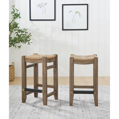 - Set includes two matching 26″H wood counter-height stools with rush seats