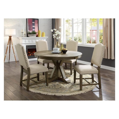 Sit back and dine in comfort while feeling fully supported with the Homes: Inside + Out Jellison Transitional Fabric Dining Chair. Its light oak finished wooden frame is paired with nail head trimming and warm colored fabric upholstery which, in turn, creates a sophisticated rustic design and warm ambiance. A high back creates interesting silhouetting. The charming design of the Homes: Inside + Out Jellison Transitional Fabric Dining Chair brings a charming, fashion-forward attitude and industrial-influenced flavor to a casual dining space.