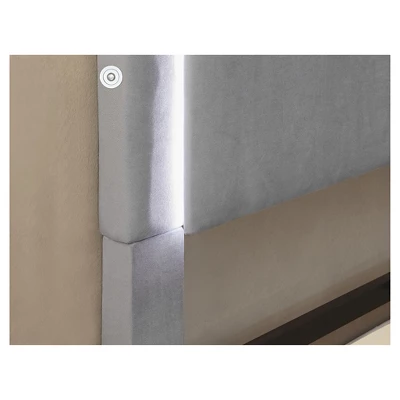For an unexpected bedroom fixture to light up your room, the Shanelle Modern Fabric Platform Bed with LED Trim is the bright choice. Tech works in the bedroom and the boardroom, and this bed is proof. A soft padded flannelette platform frame is set atop espresso wood block feet and is equipped with a mattress ready slat kit. The Shanelle Modern Fabric Platform Bed with LED Trim features a tall panel headboard with built-in LED lighting complete with an easy touch power switch.