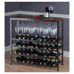Silvano Wine Rack 5 x 5 holds 25 bottles with a removable tray. Contracted from Metal in Dark Bronze Finish and wood for tray. Overall Removable Tray with handle size is 23.11″W x 10.35″D x 5.08″H. Tray serving surface is 19.29″W x 6.93″D. Comes with adjustable foot for uneven floors. Wine Holder diameter is 3.54″. Assembled Overall Wine Rack size is 25.86″W x 13.50″D x 30.16″H. Made with combination of composite wood plus veneer, metal frame and wrought iron. Assembly Required.