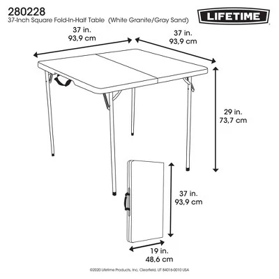 Lifetime 37-Inch Square Fold-In-Half Folding Tables are constructed of high-density polyethylene and are stronger, lighter and more durable than wood. They will not crack, chip or peel, and are built for indoor and outdoor use. Table features a compact folding design with a secure locking feature for safe and easy storage and transport. The built-in handle provides convenient carrying. The patented steel frame design provides a sturdy foundation and is protected with a powder-coated, weather-resistant finish. Ideal for home, office, crafts, outdoor activities and more!