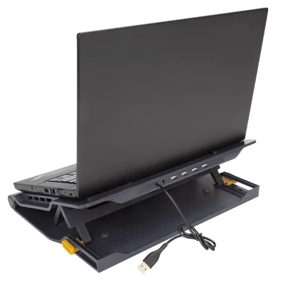 Turn your laptop into a workstation with the Targus Chill Mat®+ with 4-Port Hub. The Chill Mat+ combines a Chill Mat with all the important things you need when working at a desk.A built-in 4-Port hub allows you to connect all your peripherals all at once. Dual fans keep your laptop cool, while the adjustable height allows you to use it as a laptop stand. Use it flat, or at the highest setting (4”) with an external keyboard for better ergonomics. To keep all your cables organized, Velcro® straps help you keep everything nice and neat. The Chill Mat+ with 4-Port Hub is the ideal solution for owners looking to get the most out of their laptop.