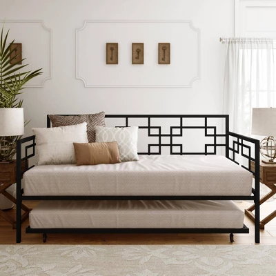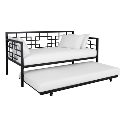 Save on space while adding style to your home with the Room & Joy Gemma Twin Daybed with Trundle. This space-saving solution is perfect for growing family, shared bedroom and guest room. Constructed with sturdy metal, the sleek and decorative metal adds a flair of modern luxury to any interior. The trundle neatly tucks away under the daybed for the ultimate in-space functionality, making it ideal when hosting overnight guests. the trundle also comes with caster wheels that lock in place, ensuring a restful night of sleep. Both the bed and trundle are equipped with premium secured metal slats that provide even weight distribution and air circulation. Designed to fit one standard twin size mattress on daybed (maximum 8 inches) and one standard twin size mattress on trundle (maximum 6 inches) – both sold separately. The Gemma is a nice lounging area by day, and a stylish bed at night. Just top it with a blanket, and colorful pillows and you are all set! Available in multiple colors, the Room & Joy Gemma Twin Daybed with Trundle ships in one box and it is easy to assemble.
