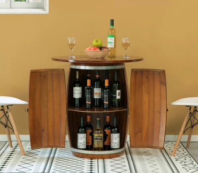 This industrial style wooden barrel-shaped bar wine rack end table will add a final touch to your dining room or wine cellar. Designed to be used in living space as well as storage areas, it provides convenient and practical storage as well as trendy industrial style. The freestanding design keeps the wine stand steady and your wine collection secure. Use it to store or display wines, liqueurs, or glasses.
