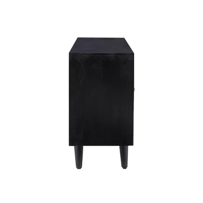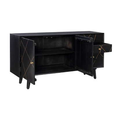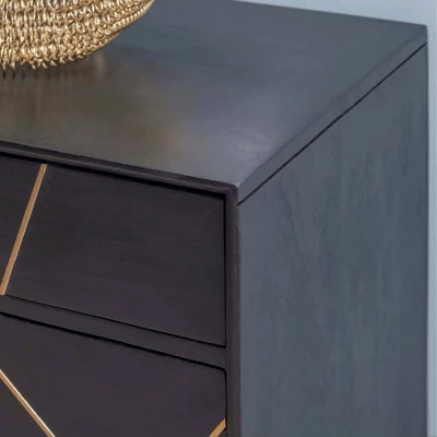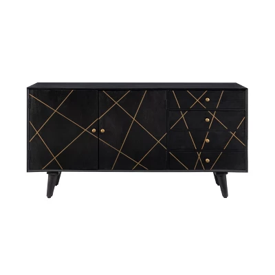 Tidy up your home while introducing a bold sense of style in one fell swoop with this eye-catching console. Constructed of solid mango wood for strength and durability you can count on, this piece boasts 4 drawers that hold up to 35 lbs a piece as well as 2 shelves that each support up to 60 lbs. The black finish with striking gold lines will pop in a variety of decor settings and serves as the perfect tv stand in your entertainment area or as extra storage in your living room, entryway, or bedroom.